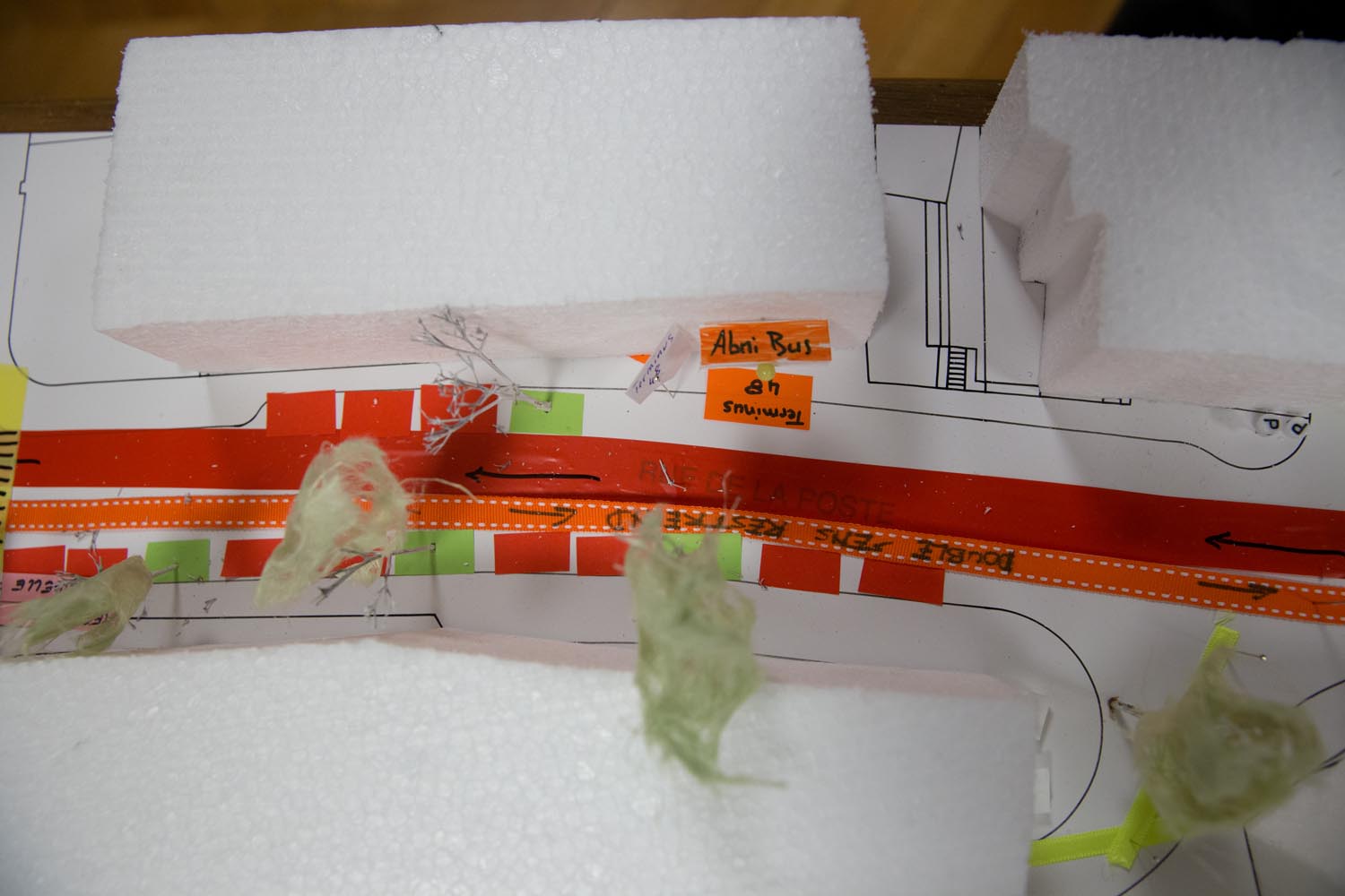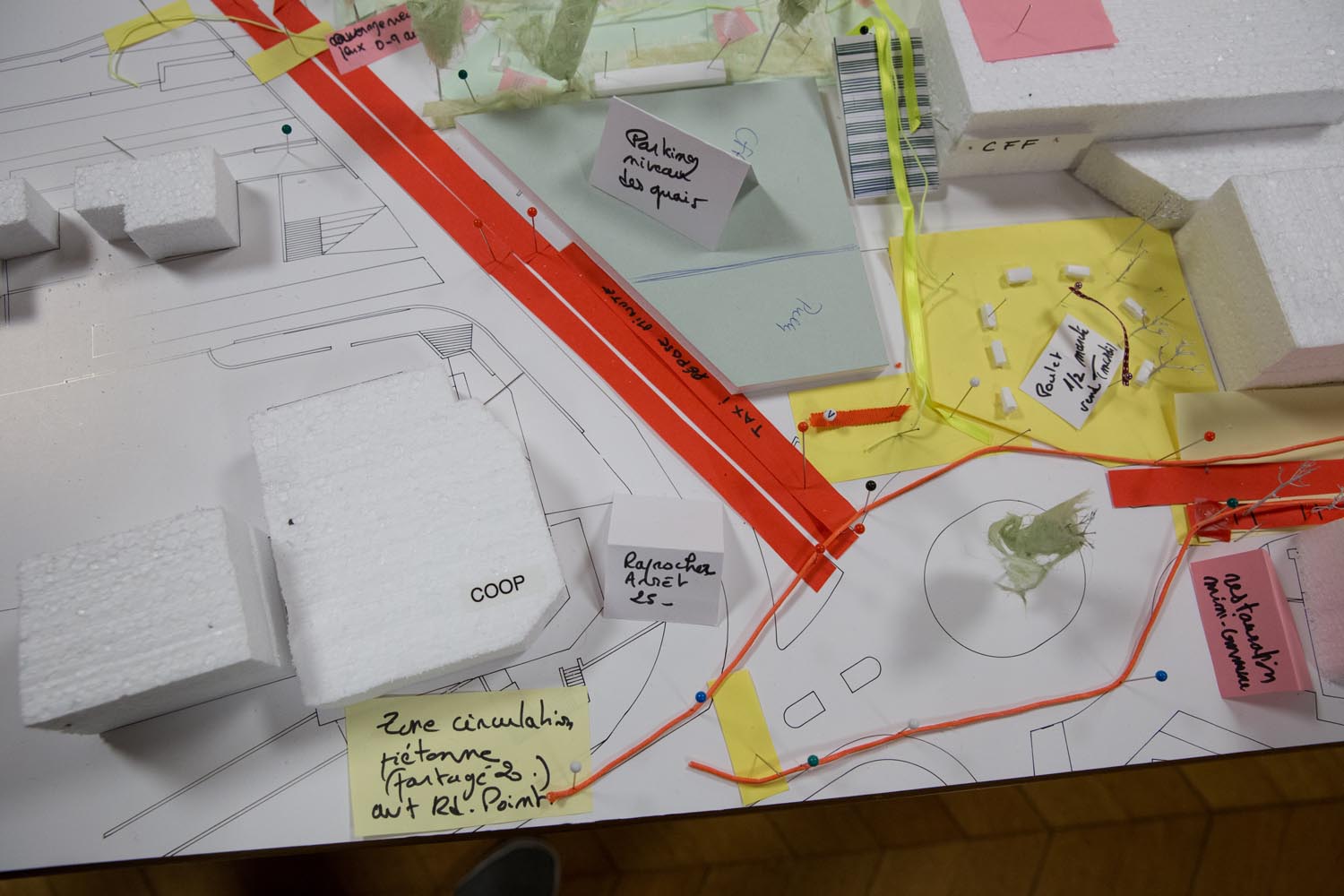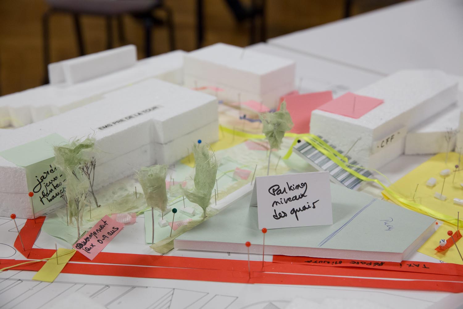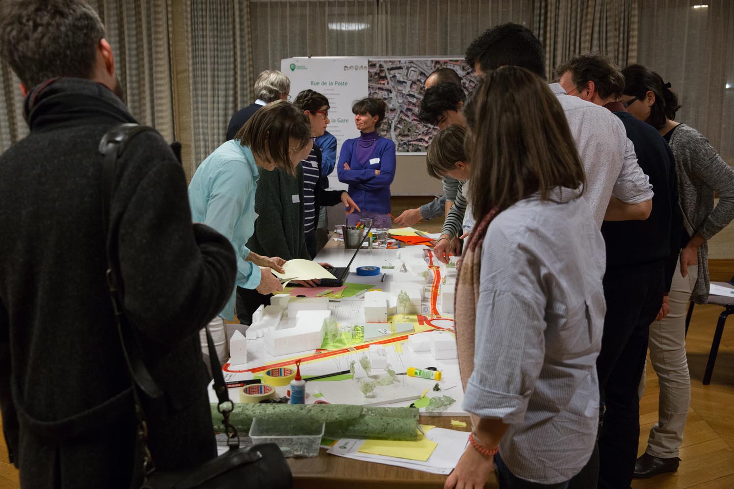 Cette session de réflexion a réuni 23 participants séparés en deux groupes dont chacun disposait d’une maquette représentant les trois espaces. Ce déroulement contrastait volontairement avec l’atelier du 20 octobre qui proposait à chacun des trois groupes de travailler sur un seul de trois espaces : la rue de la Poste, la place de la Gare ou la place Neuve. La réunification des trois espaces sur une maquette visait à stimuler des réflexions coordonnées sur l’ensemble du périmètre afin de faire émerger des propositions cohérentes.