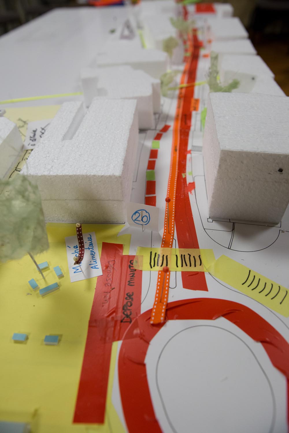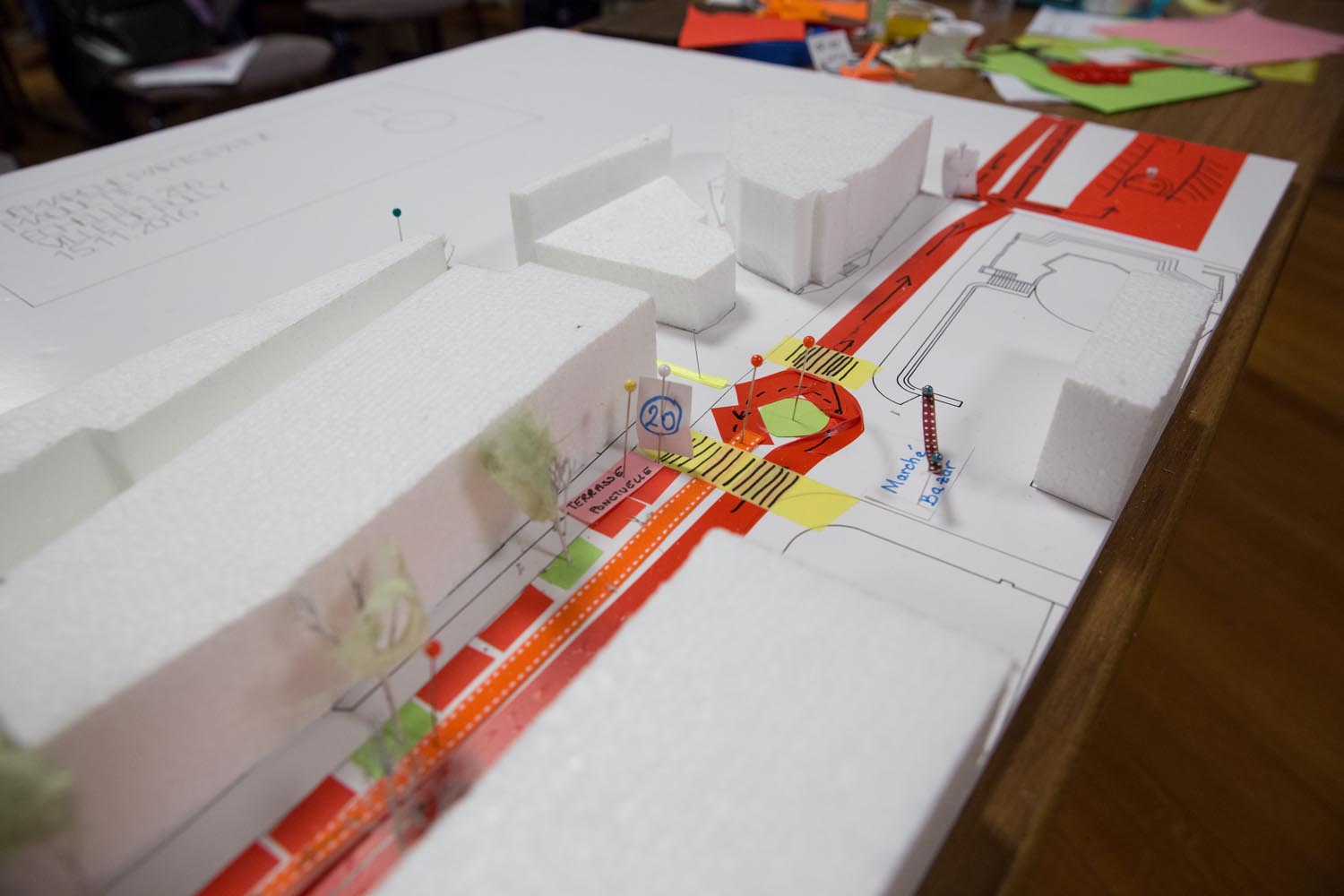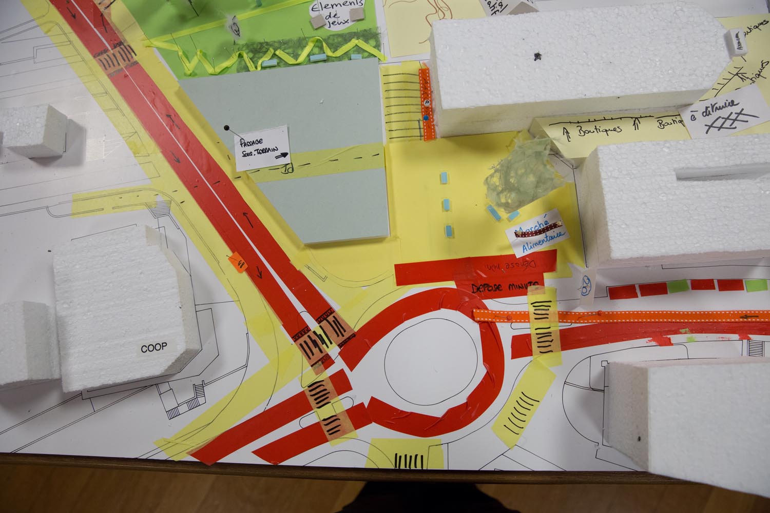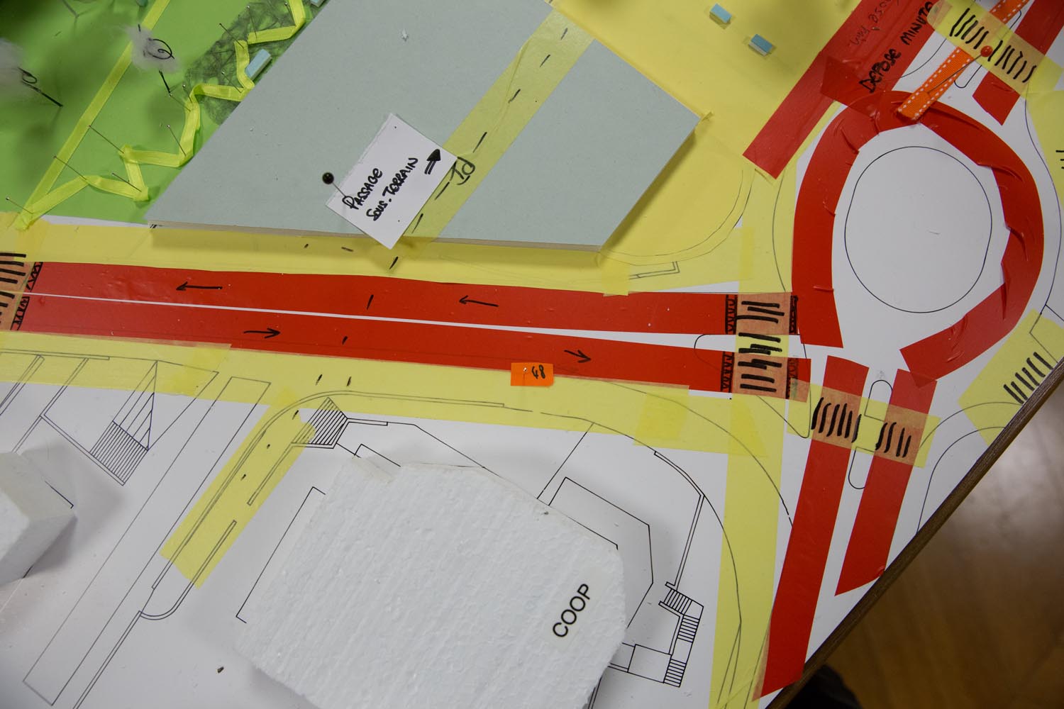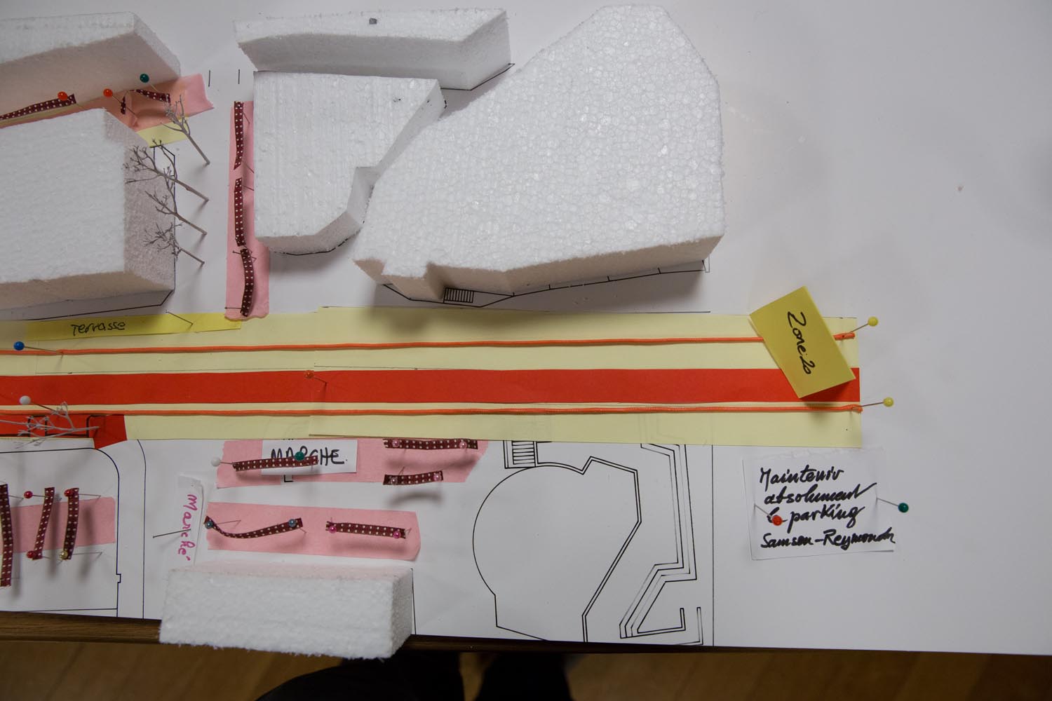 Cette session de réflexion a réuni 23 participants séparés en deux groupes dont chacun disposait d’une maquette représentant les trois espaces. Ce déroulement contrastait volontairement avec l’atelier du 20 octobre qui proposait à chacun des trois groupes de travailler sur un seul de trois espaces : la rue de la Poste, la place de la Gare ou la place Neuve. La réunification des trois espaces sur une maquette visait à stimuler des réflexions coordonnées sur l’ensemble du périmètre afin de faire émerger des propositions cohérentes.