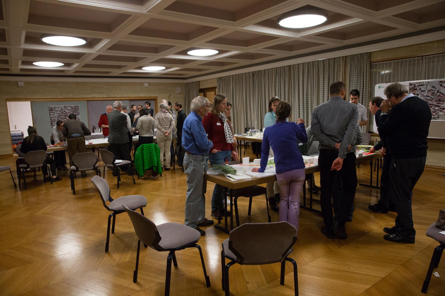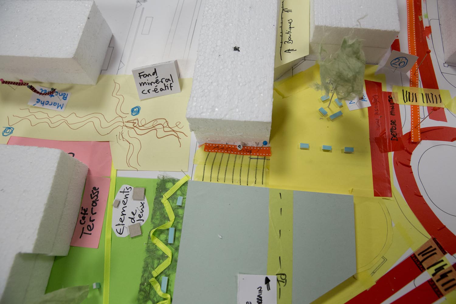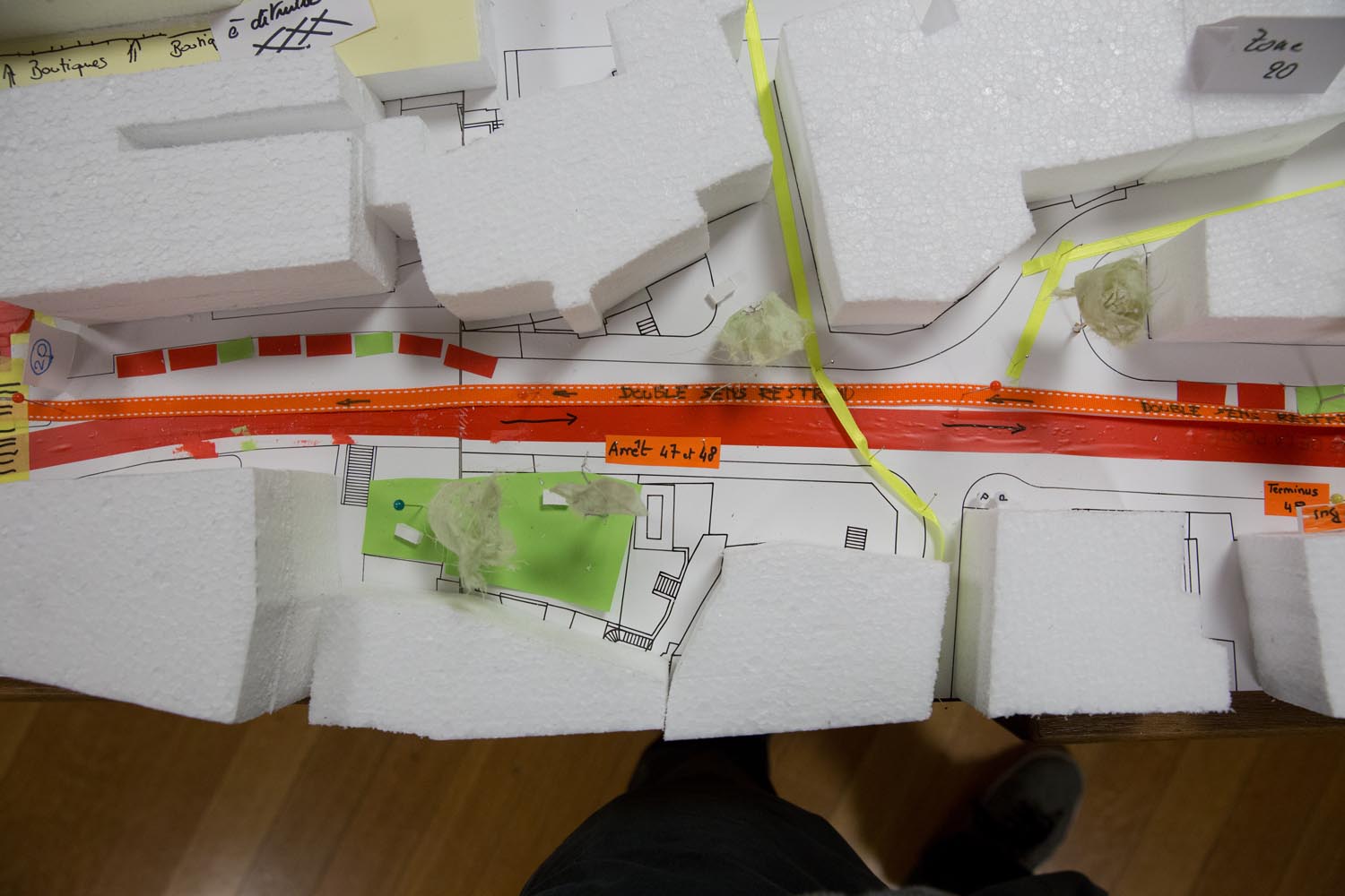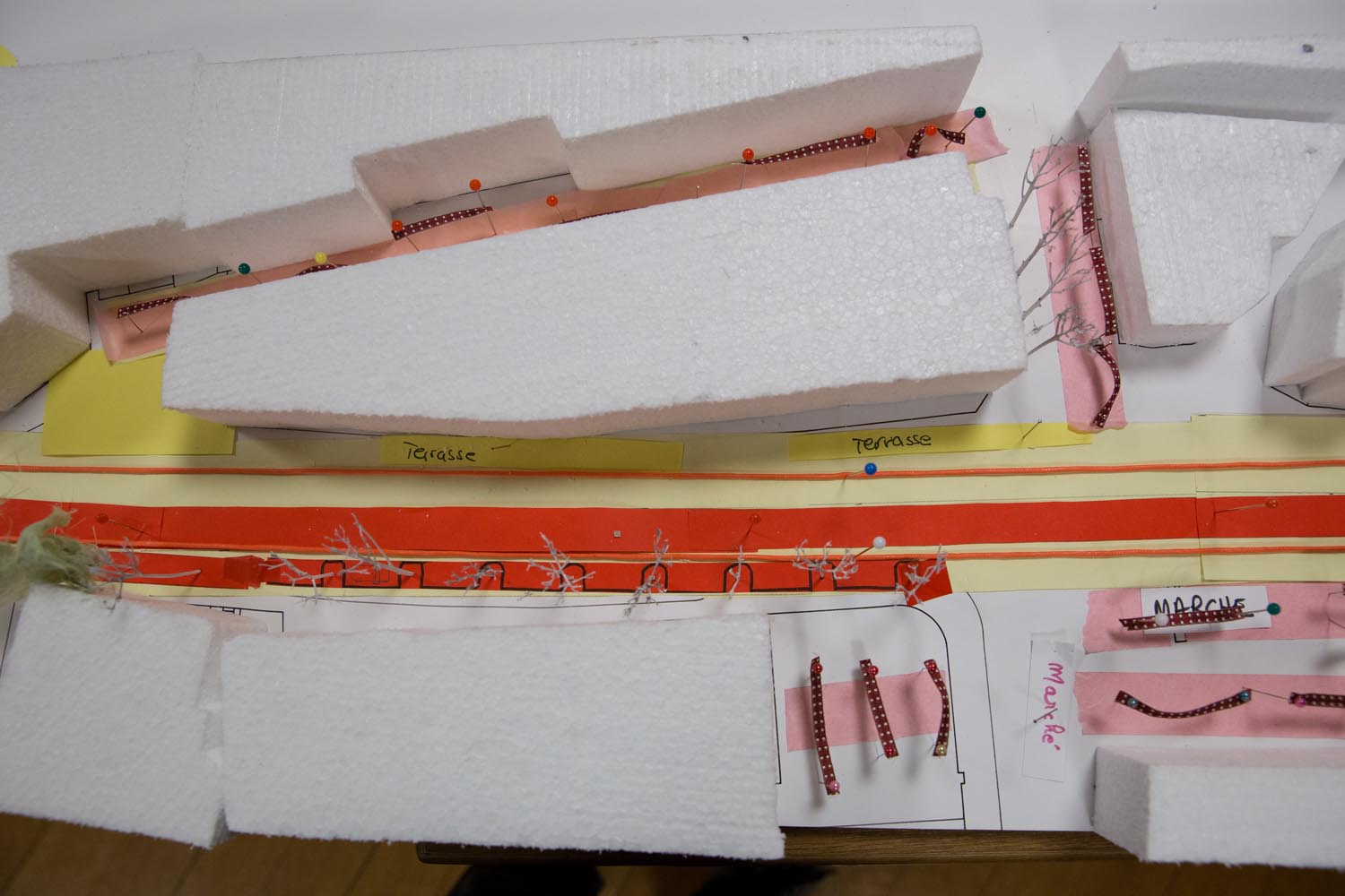 Cette session de réflexion a réuni 23 participants séparés en deux groupes dont chacun disposait d’une maquette représentant les trois espaces. Ce déroulement contrastait volontairement avec l’atelier du 20 octobre qui proposait à chacun des trois groupes de travailler sur un seul de trois espaces : la rue de la Poste, la place de la Gare ou la place Neuve. La réunification des trois espaces sur une maquette visait à stimuler des réflexions coordonnées sur l’ensemble du périmètre afin de faire émerger des propositions cohérentes.