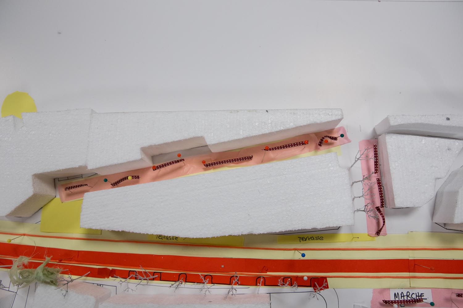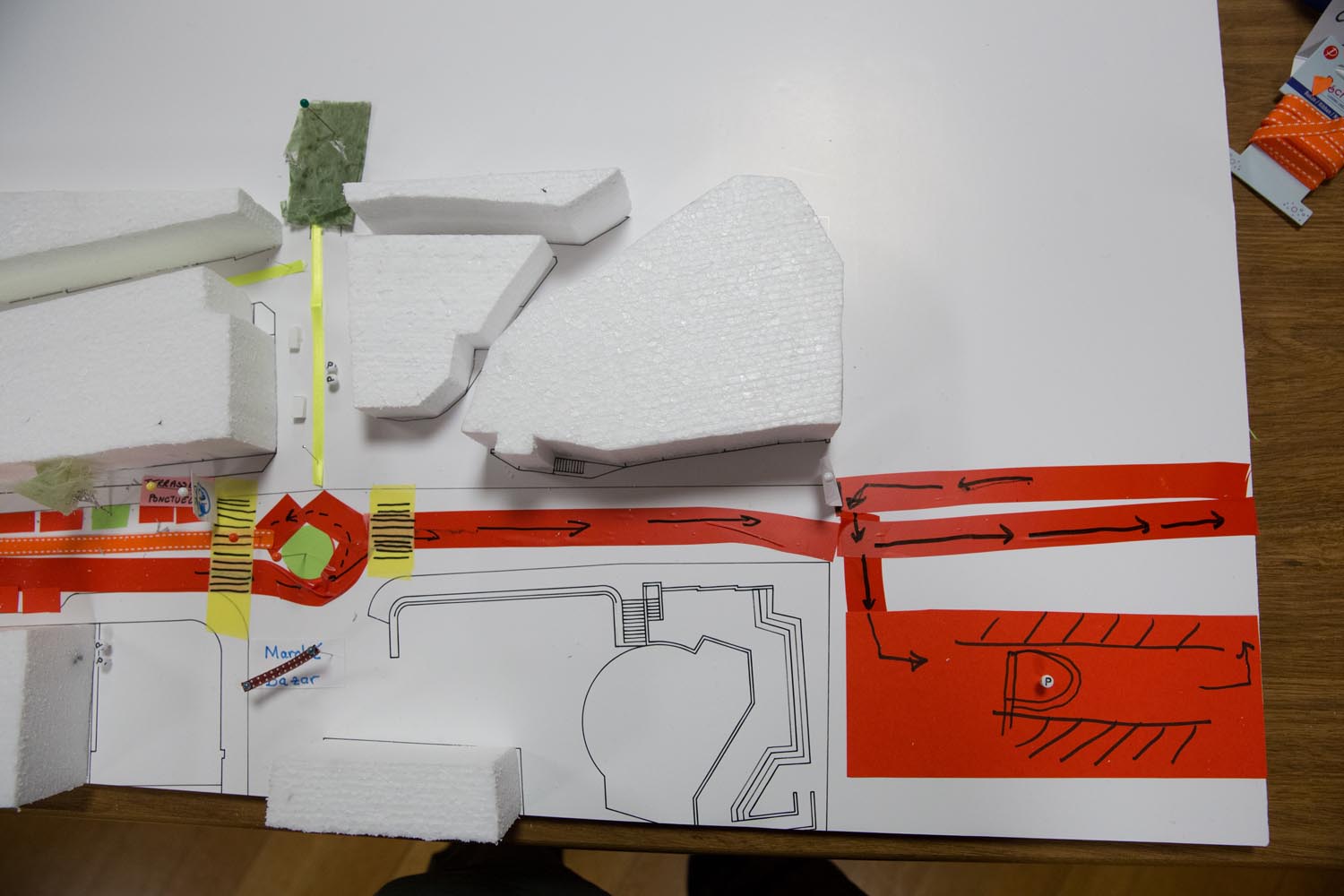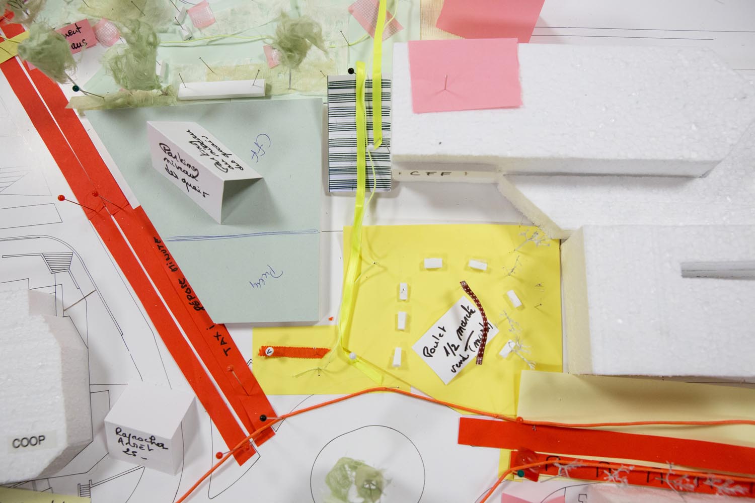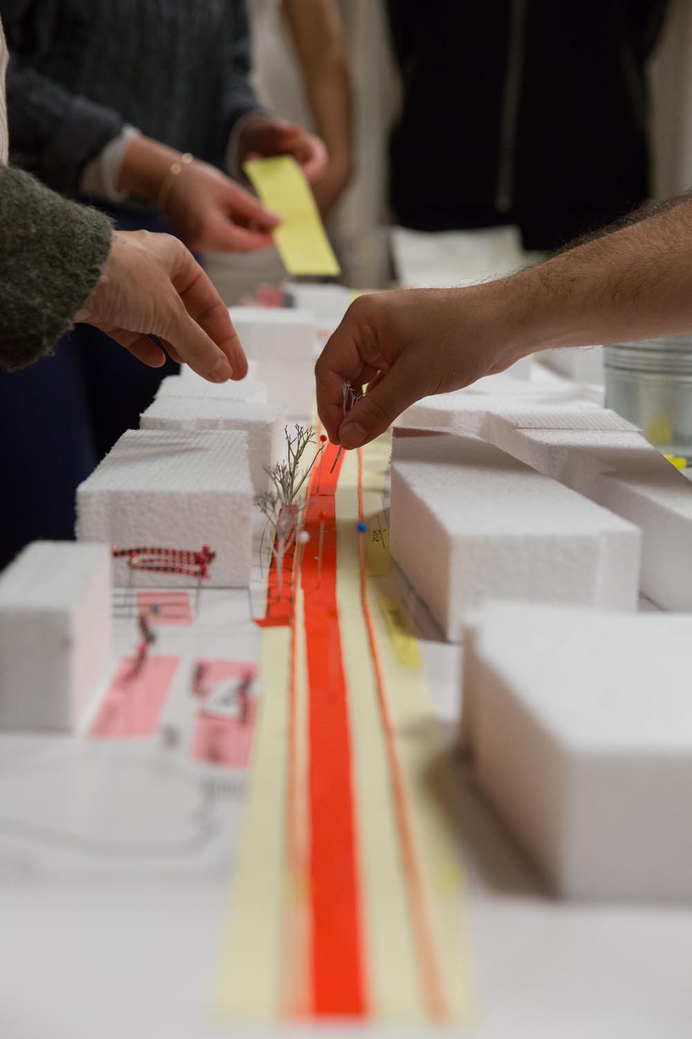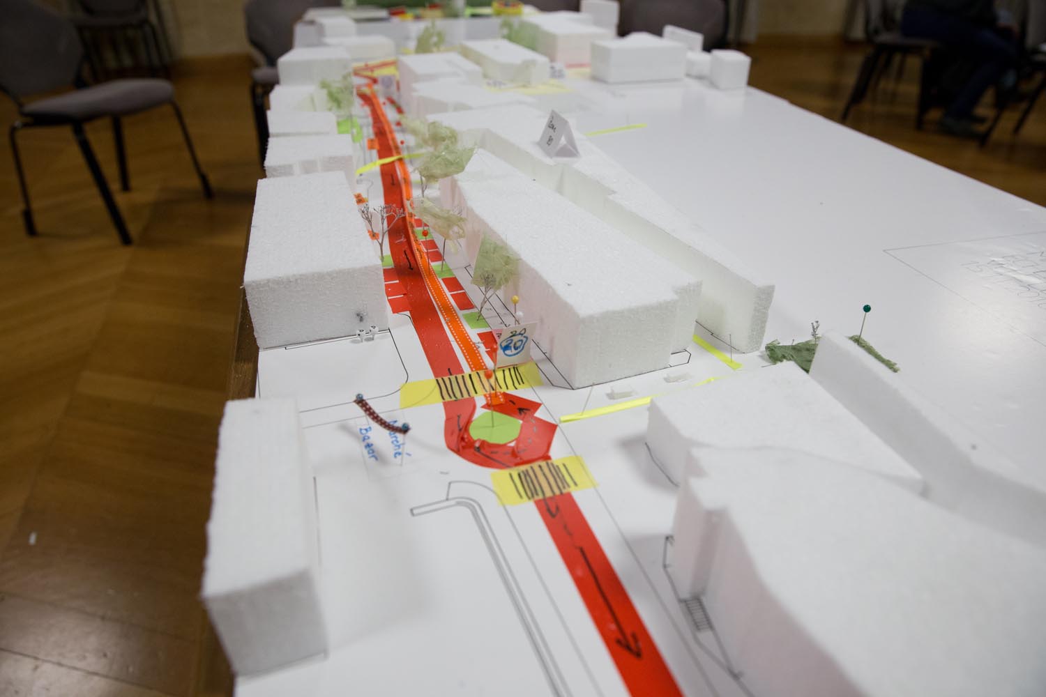 Cette session de réflexion a réuni 23 participants séparés en deux groupes dont chacun disposait d’une maquette représentant les trois espaces. Ce déroulement contrastait volontairement avec l’atelier du 20 octobre qui proposait à chacun des trois groupes de travailler sur un seul de trois espaces : la rue de la Poste, la place de la Gare ou la place Neuve. La réunification des trois espaces sur une maquette visait à stimuler des réflexions coordonnées sur l’ensemble du périmètre afin de faire émerger des propositions cohérentes.